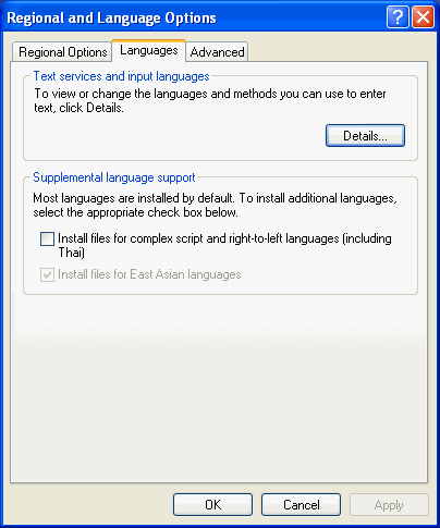If a system restart is required, return to Control Panel / Regional and Language Options after logging back into Windows. Be sure to login as an Administrator.