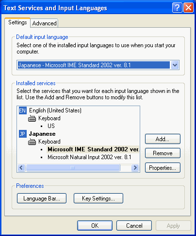- The "Text Services and Input Languages" window will open. On the "Settings" tab there is a section called "Installed Services". The Asian language you wish to use in VFP must be shown in this section.