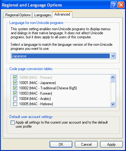 The Advanced tab will display a section at the top called "Language for Non-Unicode Programs". Select the desired Asian language from the drop-down in this section. There should not be any changes required in the Code Page Conversion" section. This is the setting that is required to be able to utilize an Asian character set in VFP.