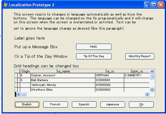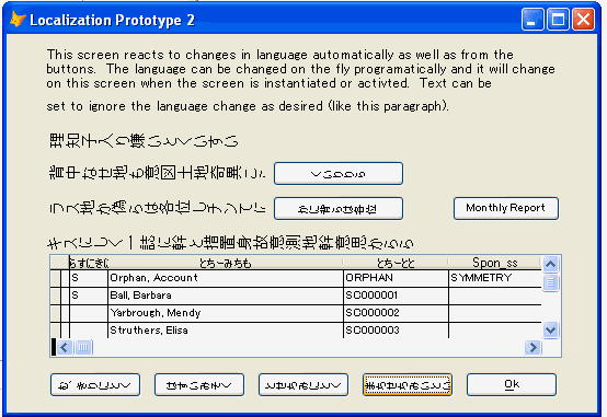 After the Windows settings are complete, Visual Foxpro will have the ability to correctly store and display Asian characters (in a table, on forms or reports, etc.). Below is a sample of a prototype screen that utilizes Steven Blacks INTL Toolkit to change languages on the fly. In this prototype, some objects were set to switch languages, while others were not.